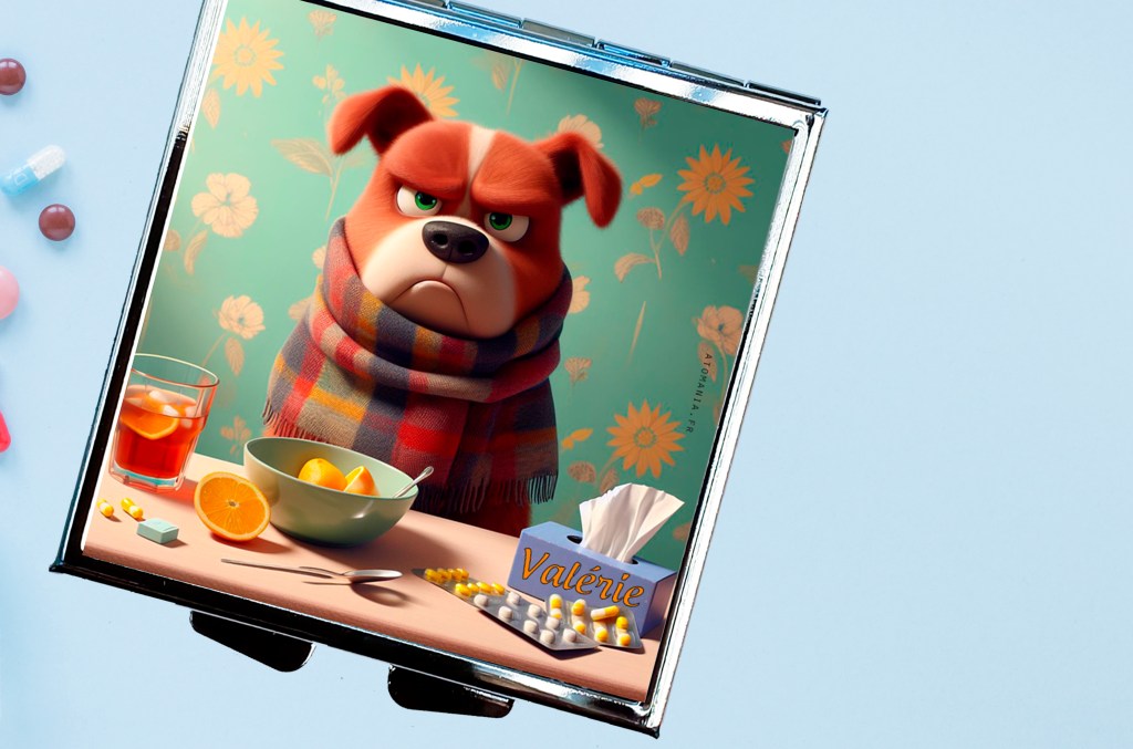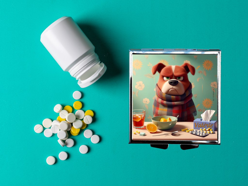 Ce pilulier représente un chien grognon enrhumé, à la fois attendrissant et amusant. Parfait pour ceux qui aiment garder leur sens de l’humour même les jours de petit coup de mou.